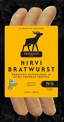 | Perniön 1930 Bratwurst Hirvi-cheddar |  | (Suomi) | 76 | € 18.37 | Sianliha(Suomi), hirvenliha(EU), Cheddar-juusto 7%, juustoa löytyy, laadukas cheddar kyseessä, mehukas, makkaramassan väri hiukan epäilyttää, melko tasainen massa, kuori hyvä ja ohut, makkara napsahtaa kivasti, massan ja kuoren suhde täydellinen, jakaa kuitenkin arvioijien mielipiteitä. (K-Citymarket, Iso Omena) |