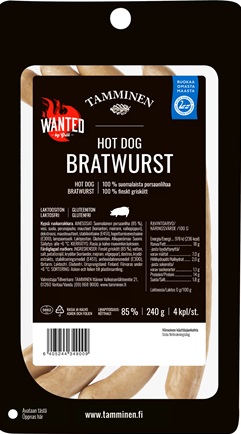 | Tamminen Wanted Hot Dog Bratwurst |  | Lihatukku Harri Tamminen Oy (Suomi) | 90 | € 8.33 | Tarjous, sianliha(Suomi), hyvä kuori, puruvastus hyvä, lihaa, pippuri oikein hyvä, löytyy muutakin makua, kiinteä rakenne, pippuri hiukan dominoi makukarttaa, maku tasainen, jokainen suupala maistuu yhtä hyvälle, tasalaatuinen tuote. (K-Market Herttoniemi) |