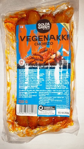 | Gold&Green Vegenakki Chorizo |  | (Suomi) | 33 | € 18.86 | Lihaton, sisältää herneproteiinia, aika pitävä kuori, sillä sisässä sahajauhoa muistettavaa tasaista , jotain muutakin, chiliä laitettu runsaasti mutta muuten mausteet karussa, teollistaiteellinen tuote, rasvaa vähän, toisaalta sinappikin tarvitsee alustaa maistelulle. (K-Supermarket Hertta) |