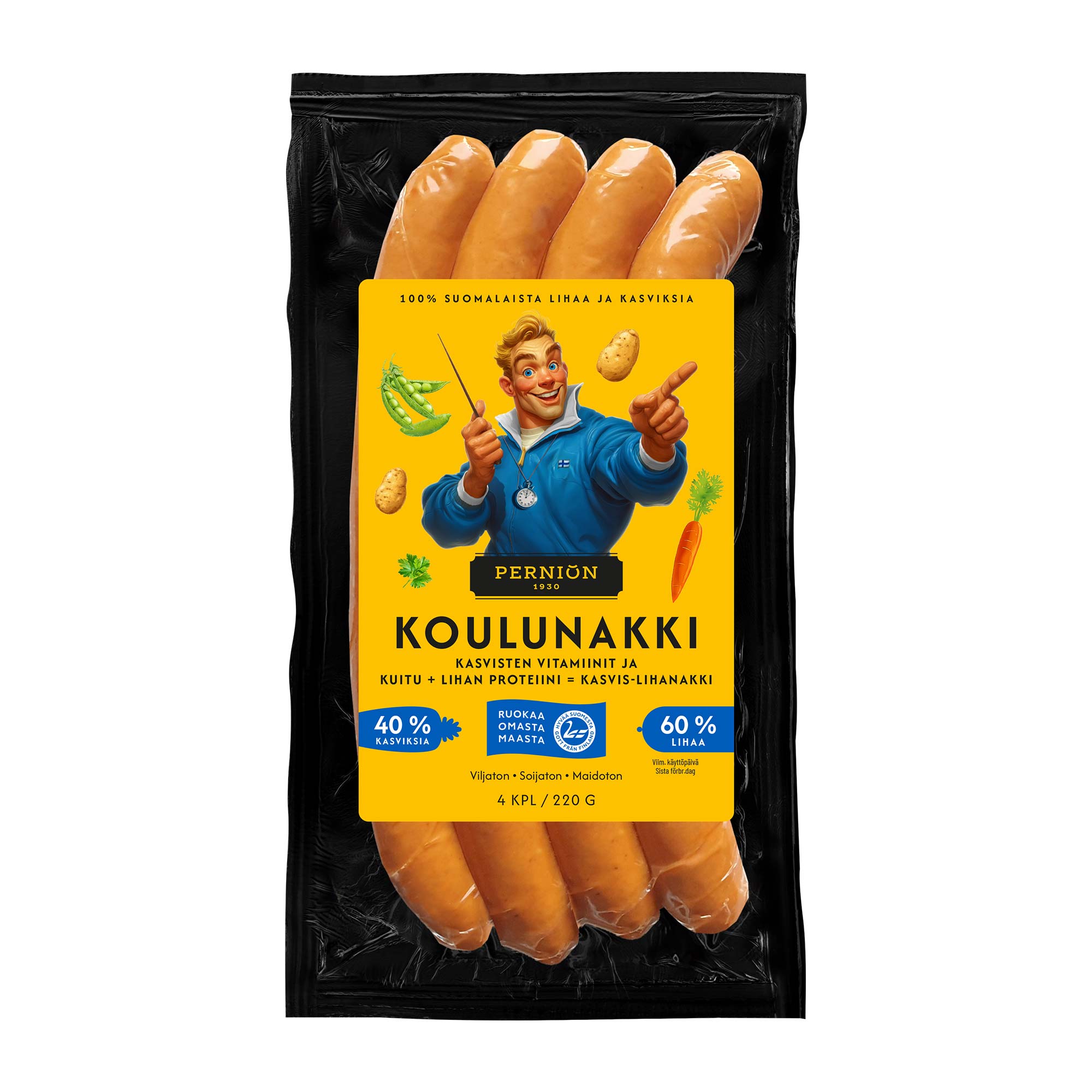 5269 | Perniö 1930 Koulunakki | Perniö 1930 Oy (Suomi) | Kana- ja kasvismakkarat | 51 | € 17.23 | Sianliha(Suomi), porkkana, lanttu, peruna etc.(suomi), lihaa 60%, kasvista 40%,rakenne rakeinen, melkein sahajauhomainen, lämmitys ei muuta paljon sitä, jotain lihaa korvaavaa substanssia mukana, puruvastus puuttuu, kuivanpuoleinen, sisällys sakkaa pahasti, suurimmalta osin mausta kateissa, suolakin piilossa. (K-Citymarket, Iso Omena) |