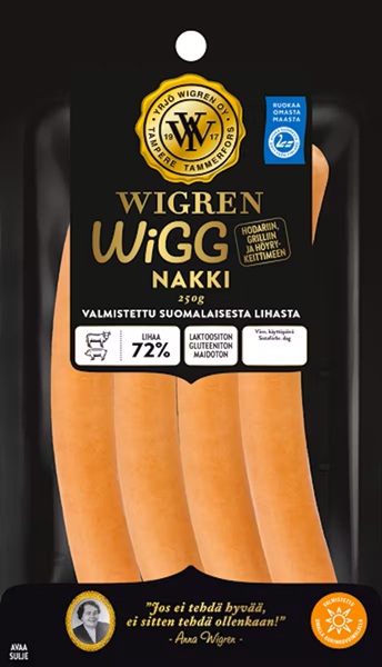 5270 | WIGG Nakki | Yrjö Wigren Oy (Suomi) | A-lk nakkimakkarat | 62 | € 16.96 | Sianliha(Suomi), rasvaisuus tulee esiin, rasvat jotenkin huonot, makkaran yleisilmekin poistyöntävä, nakilliset ominaisuudet puuttuu, jotain yrttimäistä havaittavissa, onko joku suuhun sopimaton yrtti mukana, mehevä sinänsä, tuntuu epäonnistuneelta tuotteelta. (K-Supermarket Kamppi) |