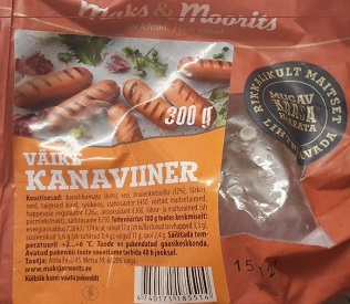 5300 | Max & Mooritz Väike Kanaviiner | Atria Eesti AS (Viro) | Kana- ja kasvismakkarat | 65 | € 7.50 | Broilerinliha(valtaosin Viro) Kiinteä rakenne, mauton, hajuton, keureton, vähärasvainen, suolaa piisaa, ton-ton makkara, pääasiallinen maku rasvan maku, lämmitys paranna tai huononna makkaraa. (Eestin Elintarvikkeet, Lahti) |