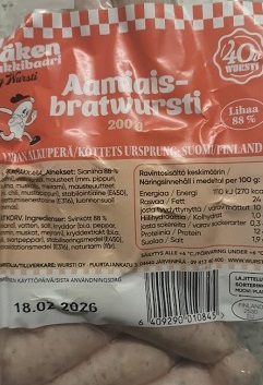 5302 | Wursti Aamiaisbratwursti | Wursti Oy, Järvenpää (Suomi) | Raakamakkarat | 84 | € 16.75 | Sianliha(Suomi) Melko karkea rakenteinen massa, hyvä kuori, lihaisa, pippureita löytyy, ehkä yrttejäkin muttei voimakkaasti, suutuntuma ja puruvastus hyvä, rasva pysyy kuvassa mukana, lihaa on runsaasti, epätavallinen koko koostumukseen nähden, tämänmallisia on sitten viidestä sentistä puoleen metriin. (K-Citymarket, Iso Omena) |
