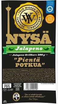 | Wigren Nysä Jalopeno |  | Yrjö Wigren Oy (Suomi) | 80 | € 13.30 | Sianliha(Suomi), naudanliha(Suomi), vihreitä palasia massassa ja muitakin värejä havaittavissa, selkeä jalapenon puraisu tuntuu, liekehtii heti, mukava polte, joka kestää pitkään, mutta kova kipuaistimus pysyy poissa ja polte pyörii miellyttävästi suussa, toisin kuin kuivatun chilijauheen piikikäs kipu, jota tuoreen jalapenon makeus ja herkullisuus lievitä, runsas rasvaisuus myös syyllinen tunteeseen. (K-Citymarket, Ruoholahti) |