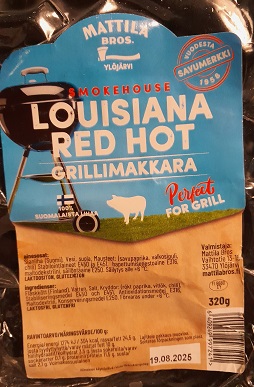 | Mattila Bros. Smokehouse Louisiana Red Hot |  | Veljekset Mattila Oy, Ylöjärvi (Suomi) | 72 | € 17.06 | Sianliha(Suomi), naudanliha(Suomi) Lihaa löytyy kiitettävästi, kuori hyvä, rakenne karkeahko, puruvastus erinomainen, huolimatta ulkonäön luomista odotuksista, mausteet loistavat poissaolollaan massan väriläiskistä huolimatta, rasvaa jonkin verran, makkaran mausteet ja muu olemus poissa balanssista. (K-Market, Töyrynummi) |