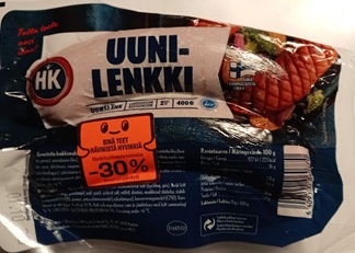 5268 | HK Uunilenkki | HKFoods Oyj (Suomi) | B-lk lenkkimakkarat | 48 | € 3.13 | Koneellisesti eroteltu liha(Sika, nauta, Kalkkuna, Broileri)(Suomi), 30% tiputusta hinnassa, kuivahko. pientä punerrusta pintaan, paistamalla paranee, kuori poistettava aluksi, kohtuullisen kiinteä kylmänä, lämmitys pehmentää rasvaiseksi ja suolaiseksi palaseksi, sopii hyvinkin vajavaiselle hampaistolle, jälkimaussa jyllää rasva ja suola edelleen. (S-Market, Herttoniemi) |