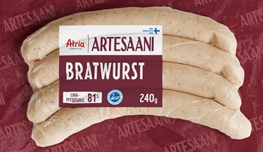 5272 | Atria Artesaani Bratwurst | Atria Suomi Oy, Nurmo (Suomi) | A-lk bratwurstit | 90 | € 14.96 | Sianliha(Suomi), lihaisa, bratwursti, hyvät mausteet, kuori erinomainen, yrttejä, pippureita. mehevä, hyvät pippurit, rakenne erinomainen tarjoaa puruvastusta, tasapainoinen, pitkä pippurinen jälkimaku. (K-Supermarket Kamppi) |