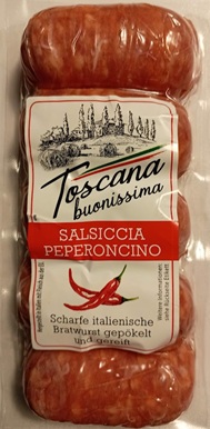 5273 | Toscana Buonissima Salciccia Peperoncino | Salumifici Granterre SpA (Italia) | Raakamakkarat | 86 | € 13.30 | Sianliha(EU), mukava polte poskissa pitää hereillä maistelijan, melko runsaasti chiliä, vaikka hiukan kuivanoloinen massa, tarjoaa ns. huulirasvaa, rasvat hyvänlaatuiset, puruvastusta riittää, lihaa karkeaksi jauhettuna, kuori syötävä, miten sitten syökin. (LIDL) |